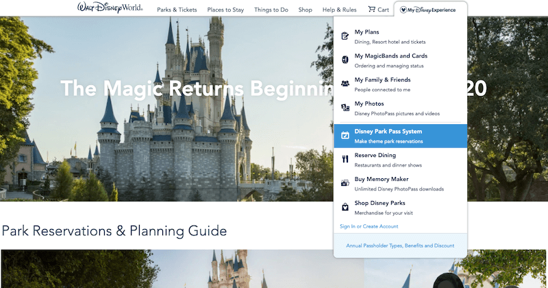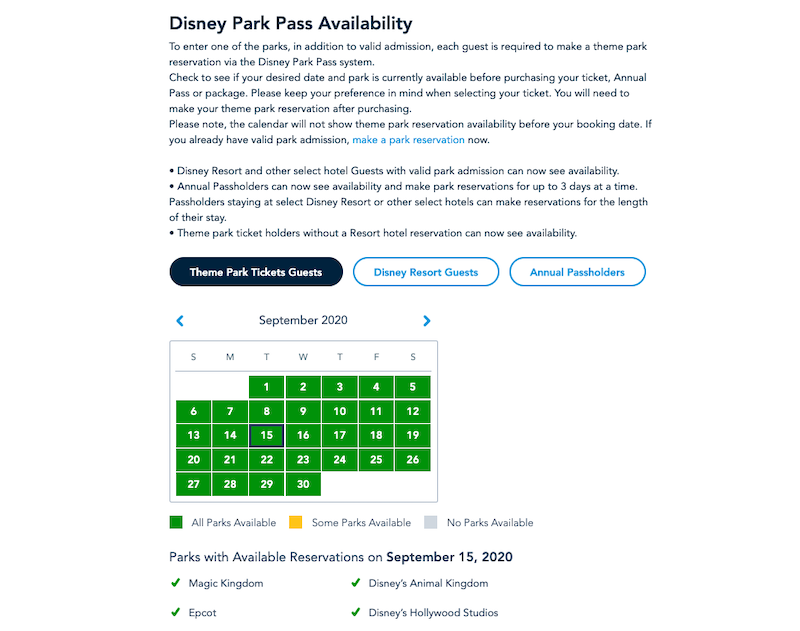 As visitas aos parques da Disney Orlando estão permitidas para logo após a reabertura dos parques da Disney em Orlando, no dia 11 de julho, porém as reservas já estão liberadas desde o final de junho. Em 22 de junho, foram disponibilizadas para aqueles que possuem ingressos e reservas em hotéis da Disney Orlando; já no dia 26 de junho, abriram para os portadores de Annual Pass (Passes Anuais). Enquanto em 28 de junho, as reservas foram disponibilizadas aos demais visitantes que possuem um ingresso de entrada válido.