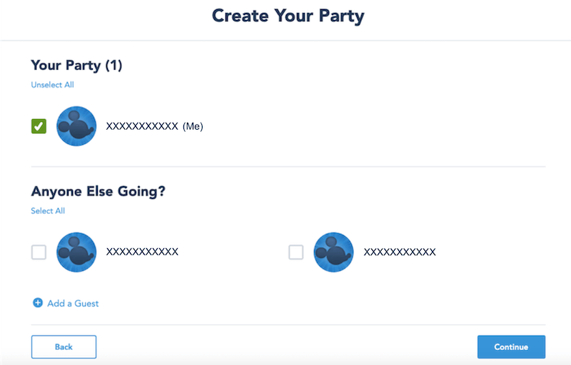 Após acessar a página do sistema Disney Park Pass, selecione as pessoas que farão parte do seu grupo em “Create Your Party” (Crie Seu Grupo). Assim, você conseguirá fazer reservas para todos ao mesmo tempo e garantir que possam visitar o parque da Disney Orlando no mesmo dia. Para isso, é necessário que todos os visitantes do grupo estejam com o mesmo tipo de ingresso, podendo ser comum ou anual, e o mesmo tipo de reserva de hotel Disney, caso haja. Se não forem os mesmos, as reservas para visita ao parque temático deverão ser feitas separadamente.