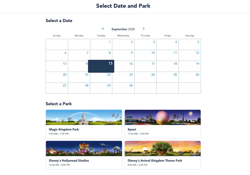 Em seguida, escolha uma data, um horário e um parque temático da Disney Orlando. No momento, há apenas uma opção de horário disponível e é possível visitar apenas um parque por dia. As reservas estão disponíveis para visitas até 26 de setembro de 2021.