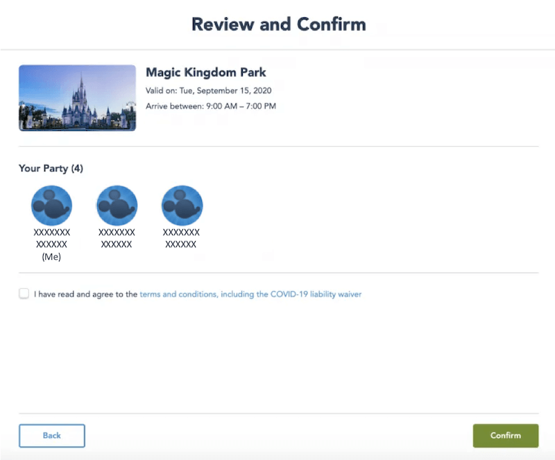 Revise e confirme todas as informações e, se for preciso fazer alguma alteração, basta voltar aos passos anteriores. Se você e seu grupo tiverem ingressos de entrada para mais de um dia, é necessário fazer uma reserva para cada dia. Entre em “Make Another Park Pass” para fazer outras reservas. Após finalizadas, elas aparecem na página “My Plans” (Meus Planos).